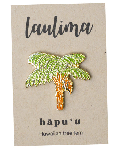 Share your love for native plants with the hāpuʻu enamel pin. Hāpuʻu, the Hawaiian tree fern, is a keystone forest species of ecological importance. Once heavily harvested in the 19th and 20th centuries, the widespread loss of native tree ferns damaged Hawaiʻi’s forests, making remaining hāpuʻu especially vital today.